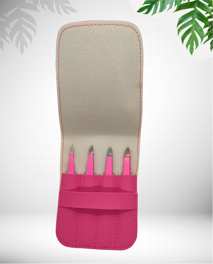 Made Of Surgical Grade Stainless Steel 4 Pcs Eyebrow Tweezers Set In Pink Color With Pink Pouch